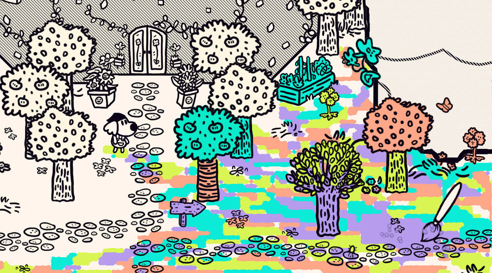 Chicory: A Colorful Tale is an adventure where you play an everyday dog thrust into the role of wielding a magic brush. The world starts black and white but you colour it in with your paintbrush to solve puzzles and help your animal friends. It looks like a children's storybook but also engages with themes of performance, competition and impostor syndrome.