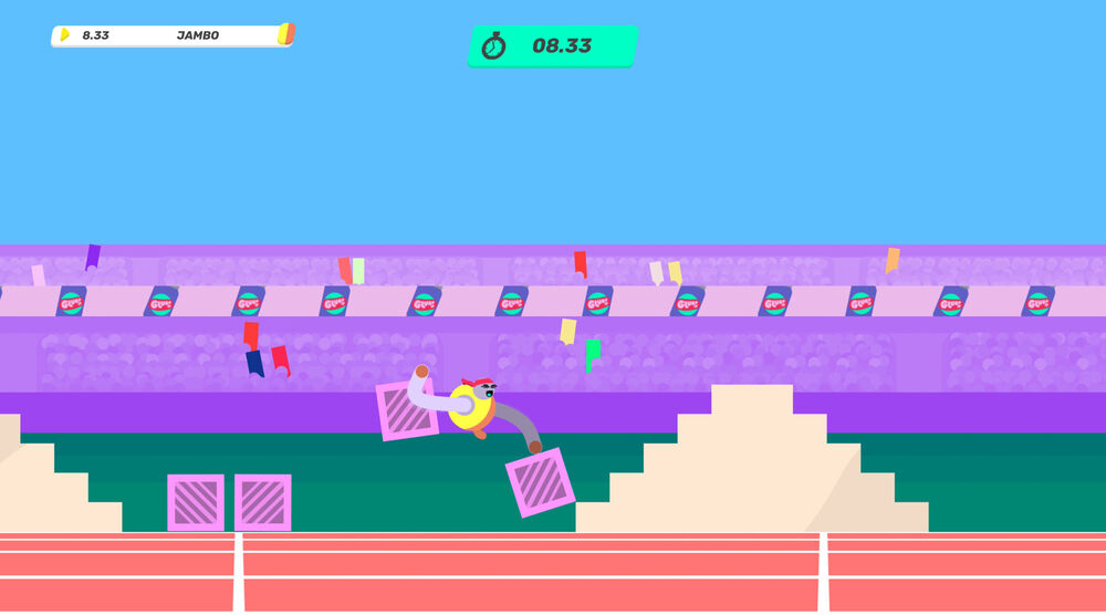 Run, jump, throw and compete with up to 20 people in the Party Mode or aim to score on the online leaderboards in Challenge Mode. Each game has a sponsor which adds different abilities to change up the challenge. This might add low gravity or super-strength throughout. Or maybe sticky arms or exploding fists.