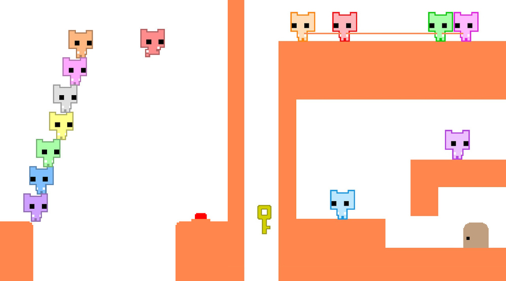 Each player controls one of the brightly-coloured characters, who can move left and right, jump, and collect keys. As you progress through each of the 48 primary levels, you need to work together to cross vast chasms, unlock doors, push walls and activate switches to clear the stage. In this way, you discover that your simple abilities can be combined to take on seemingly insurmountable hurdles.