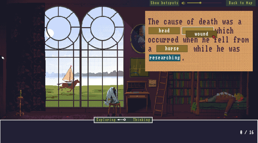 You play in either Thinking (putting words together) or Exploring (collecting words). This means you can investigate more freely to solve each of the deaths. You then pick your suspect, identify the weapon, deduce the motive and unmask the awful truth.