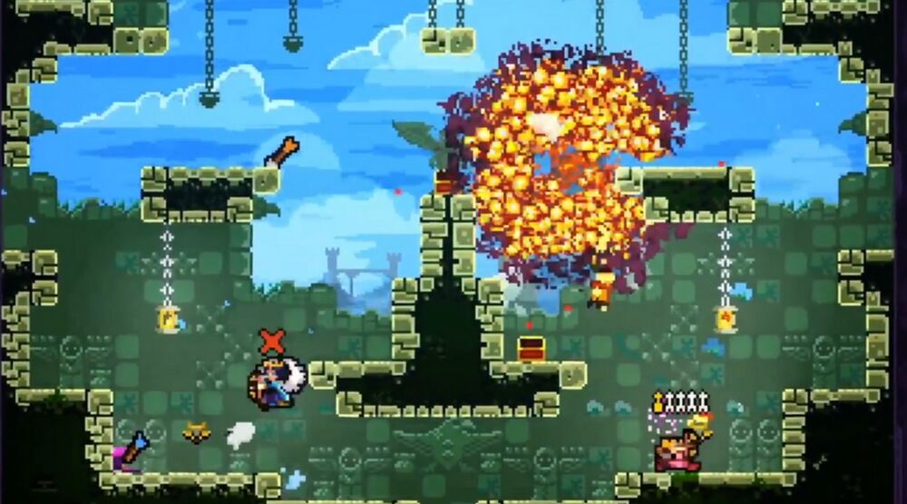 TowerFall Ascension is a running, jumping and archery game where each player selects a pixelated knight and fights to eliminate opponents by shooting them with arrows or jumping on their heads. Play is about quick reactions and second-guessing what your human or computer opponents will do. It stands out for the multiplayer mode where up to six players battle it out with limited resources of arrows and all manner of customisable powerups each round.
